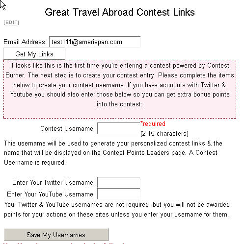 We'd like to show you just how easy it is to get lots of points. Points are the key to AmeriSpan's contest. Points allow you to win outright if you are the first to 500 points or 1000 points. If you can't do that points are like raffle tickets, the more points you have the more chances you have of winning prizes in the drawings. So what should you do to turbocharge your chances? Make sure to link your Twitter, Facebook and Youtube accounts. Don't have an account at any of these places? Take 5 minutes and join because it makes it much easier to get points. If you haven't joined the contest then go here: Join Contest. When joining, you should enter your Twtter, Facebook and YouTube usernames, If you have already joined but forgot to do this, then go to Join Contest page and select manage Manage Account. You will receive a password and then can make changes to your account. The following screenshots are for new contestants